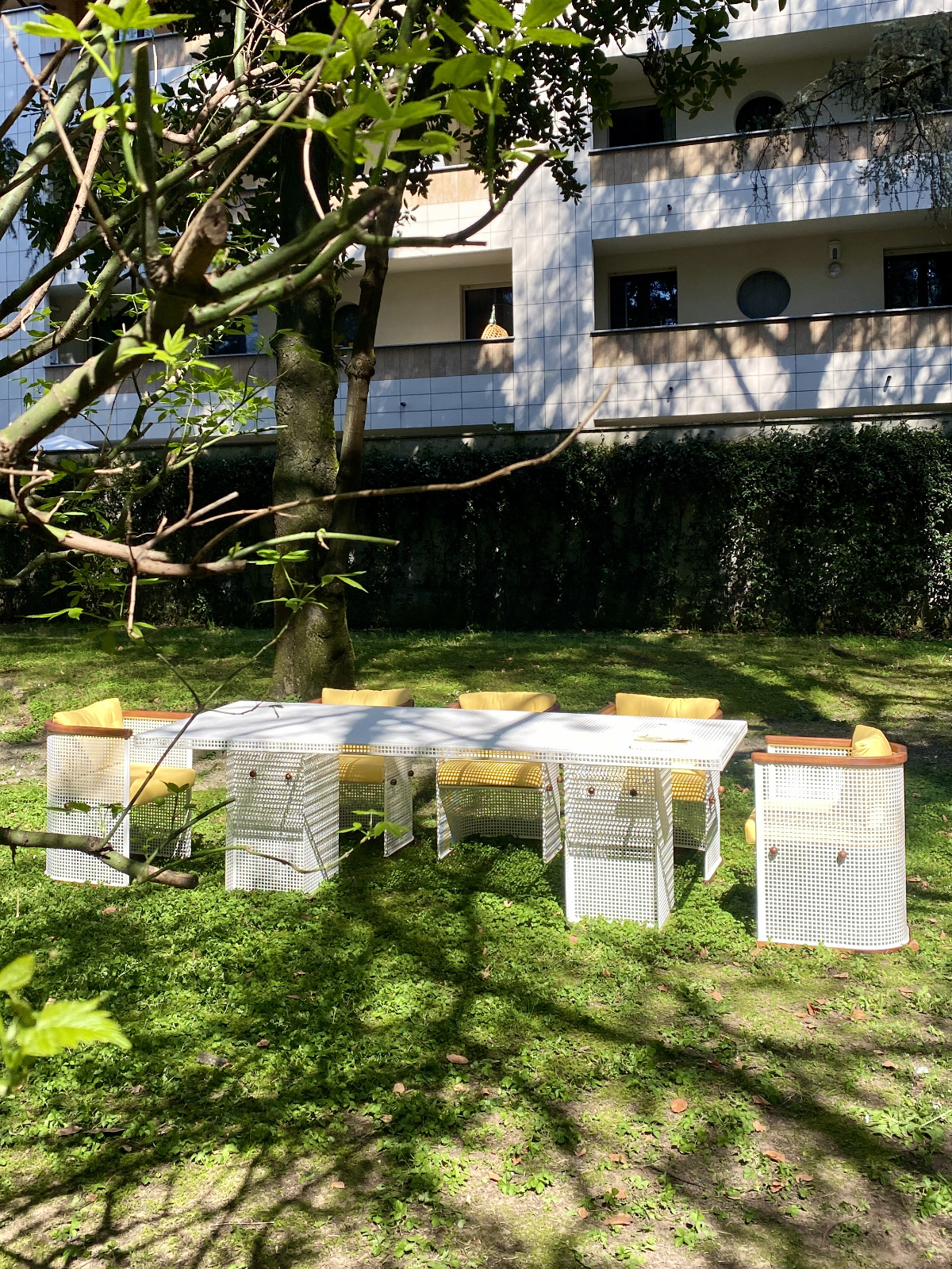 The Conservatory Collection by Yaniv Chen marked Lemon’s debut in outdoor furniture, reworking Josef Hoffmann’s 1905 patterns into perforated steel chairs and loungers that dapple light like lace.