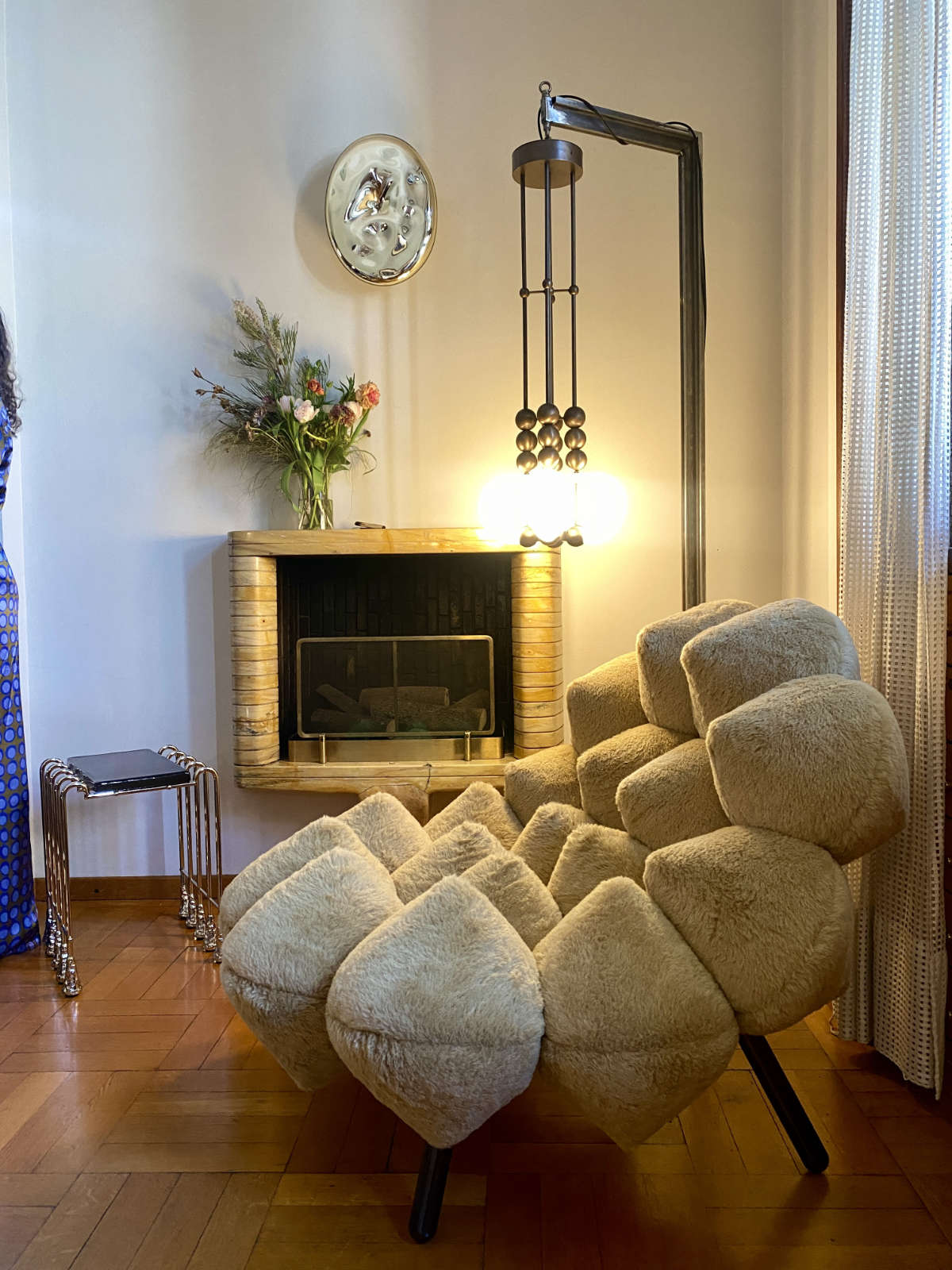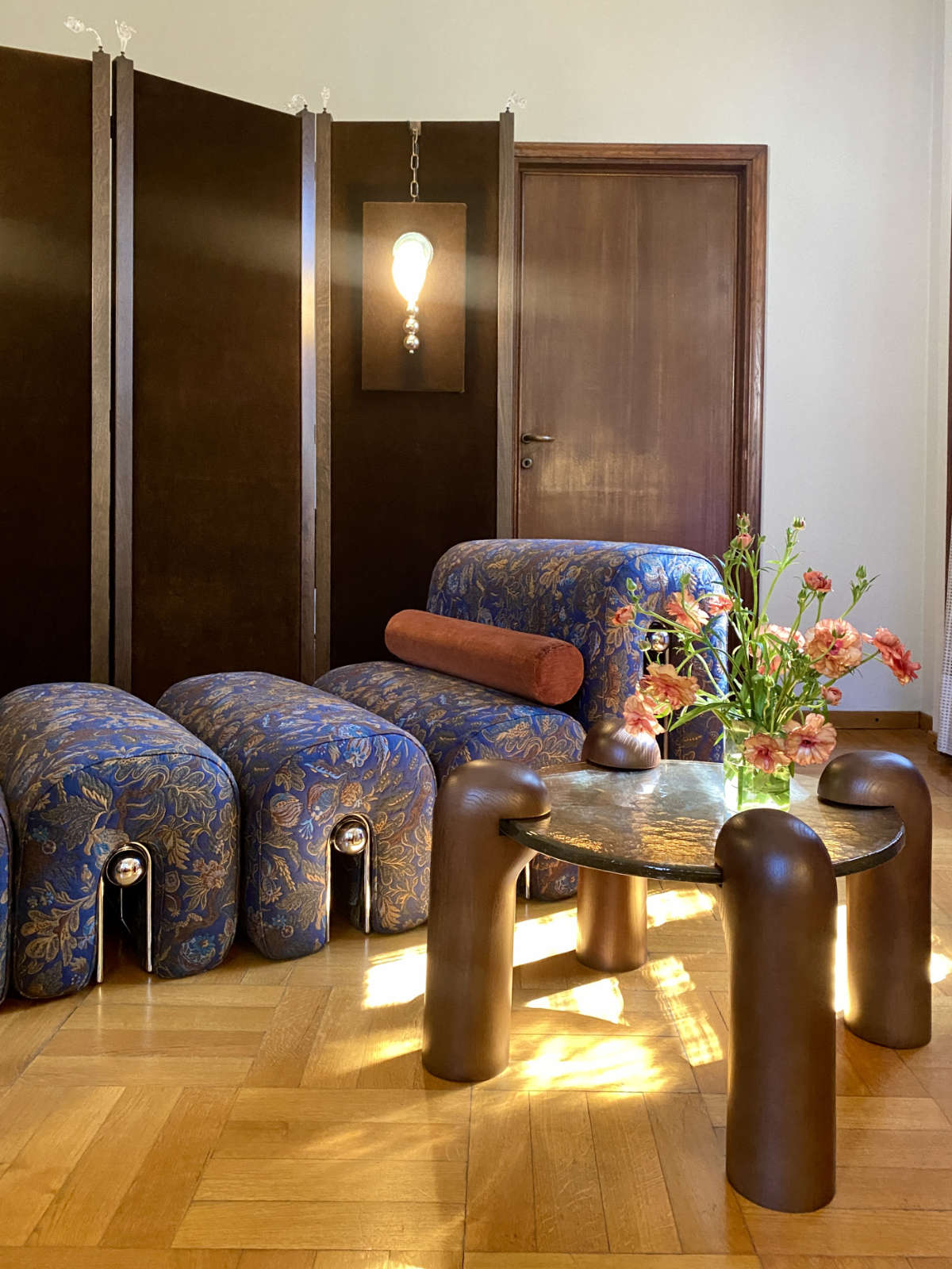 The Sfondo divider screen, draped in wool mohair and crowned with Sbiaccamo, hand-sculpted Murano glass finials that echo the fleeting beauty of flowers.