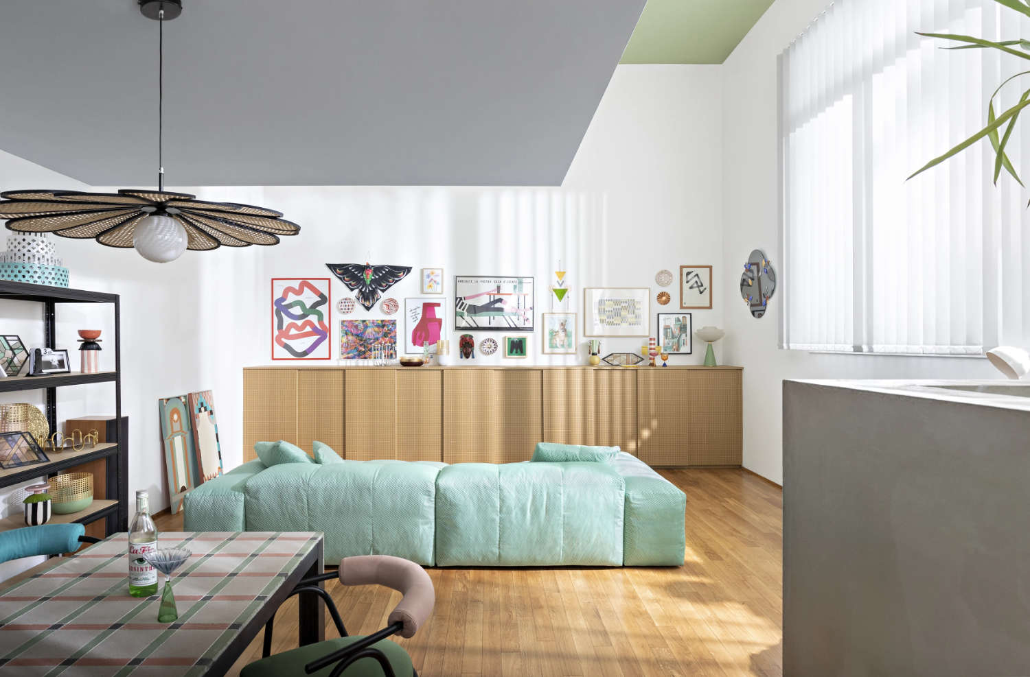 The loft’s focal point is a sprawling open space, where the Pixel sofa by Saba invites to relax. Draped in the luxurious Loop fabric by l’Opificio, the sofa exudes comfort and style, while the custom wall unit covered in Alpi surfaces rises seamlessly, providing a canvas for Serena’s self-productions like the whimsical Calypso glasses and Nebula bongs. This living area is not just a place for gathering; it’s an inspiration hub, adorned with a colorful art wall that captures Serena’s creative spirit and sets the tone for a life filled with imagination and boundless possibilities.